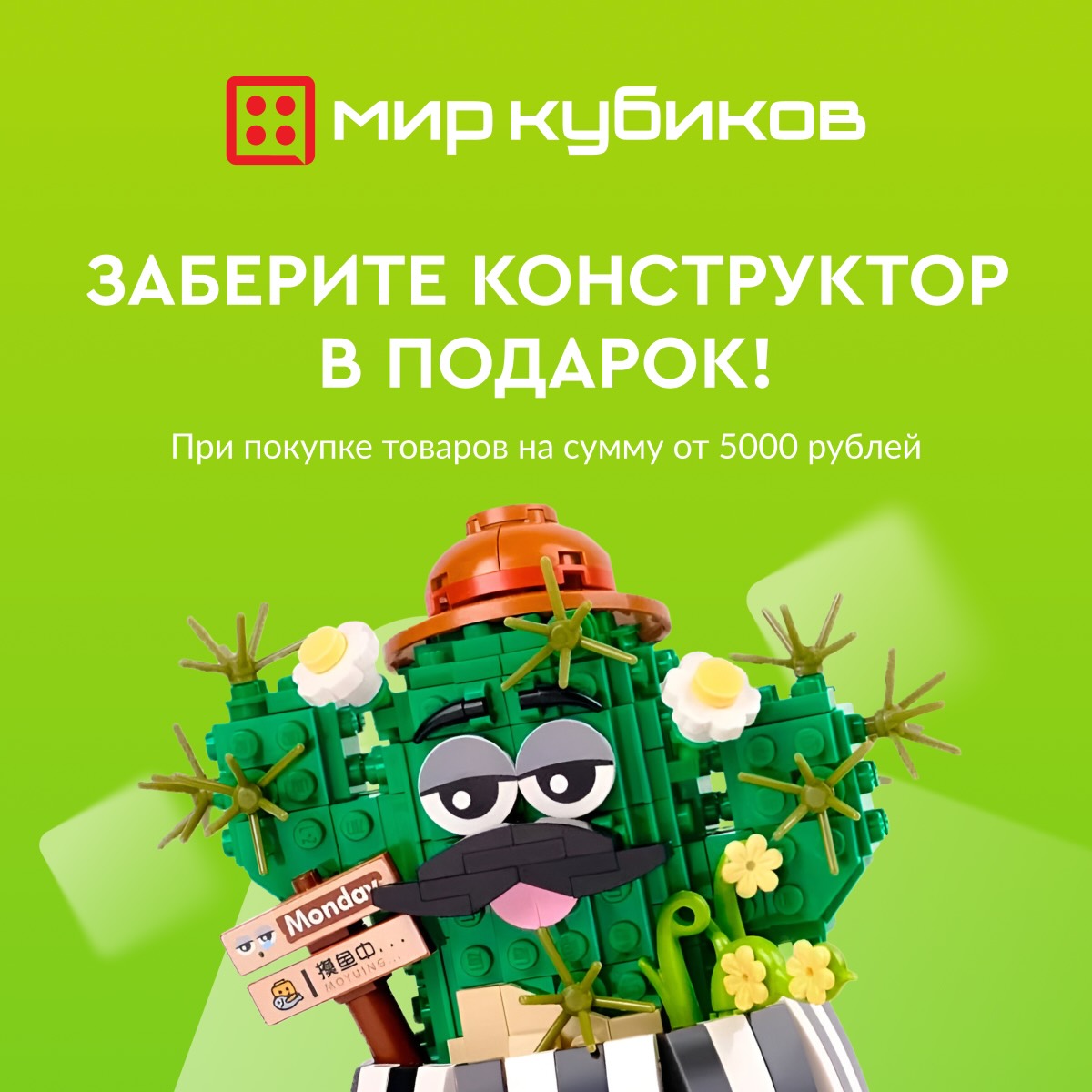 До 30 апреля 2026 года в магазине «Мир Кубиков» при покупке любых товаров на сумму от 5000 рублей вы получаете конструктор на выбор в подарок.