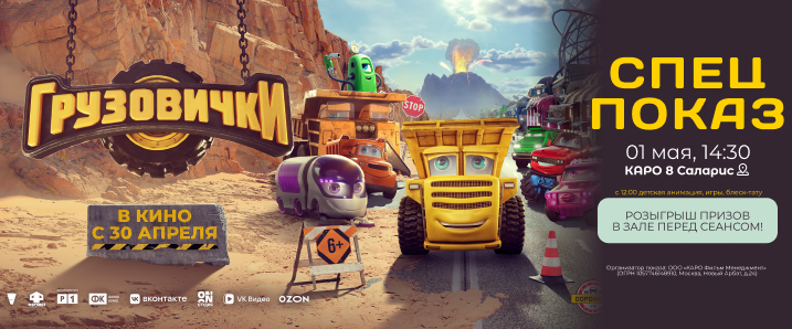 01 мая приглашаем вас в кинотеатр КАРО 8 Саларис на специальный показ детского фильма «Грузовички».